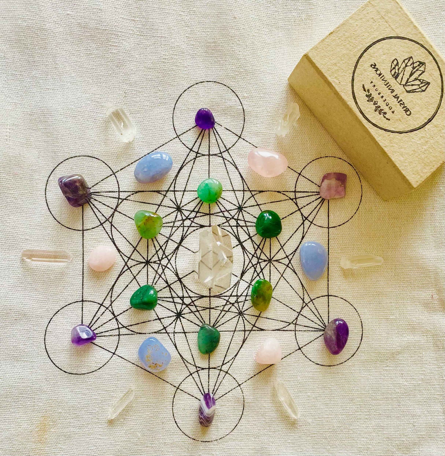 Crystal grids are a spiritual and energetic practice that involves arranging crystals in specific geometric patterns to harness their collective energies and intentions. These grids are believed to amplify the crystals' individual properties and create a unified, synergistic force to support various goals and intentions, such as healing, protection, manifestation, or meditation.