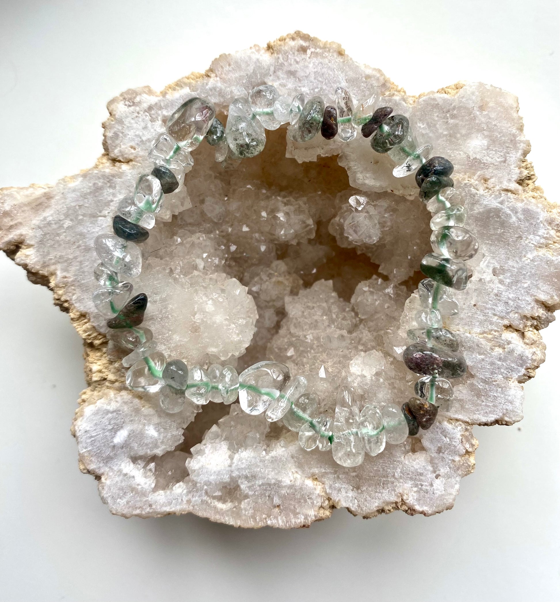 These Garden Quartz Chip Crystal Healing Bracelet, are a harmonious blend of natural beauty and profound healing energy. Garden Quartz, also known as Lodolite, captivates with its mesmerising inclusions resembling a miniature garden within each stone, offering a unique journey of discovery and transformation.